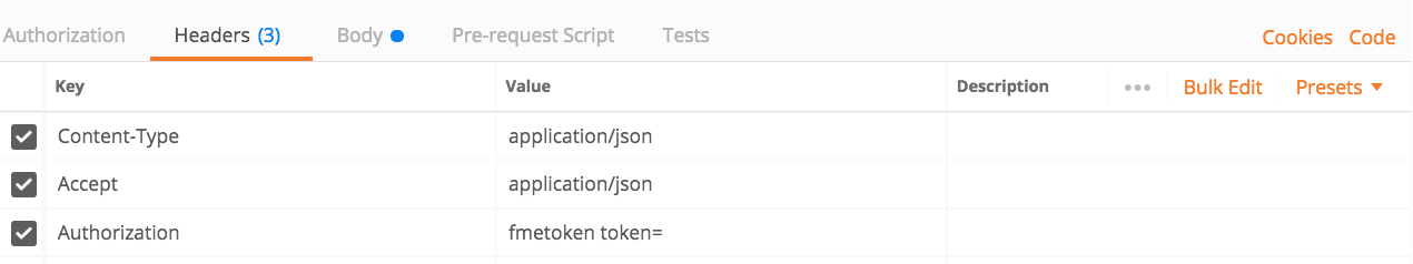 In this call we have a request body, that will be in JSON. This is displayed in the Content-Type section. Additionally, we are requesting JSON back which is under Accept = application/JSON. The Authorization is where you would enter your token.