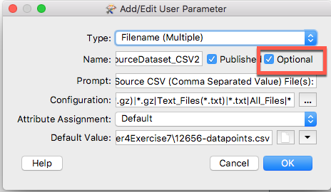 However, there is one important change that is required for this translation to work in this call. The CSV has to be an optional parameter. This is because the data will be sent in the body of the POST request to the URL and not by setting the path to the source dataset parameter in the workspace. The source dataset parameter will need to be left unset for this to work, so we need to make it optional to prevent the workspace from throwing an error about this.