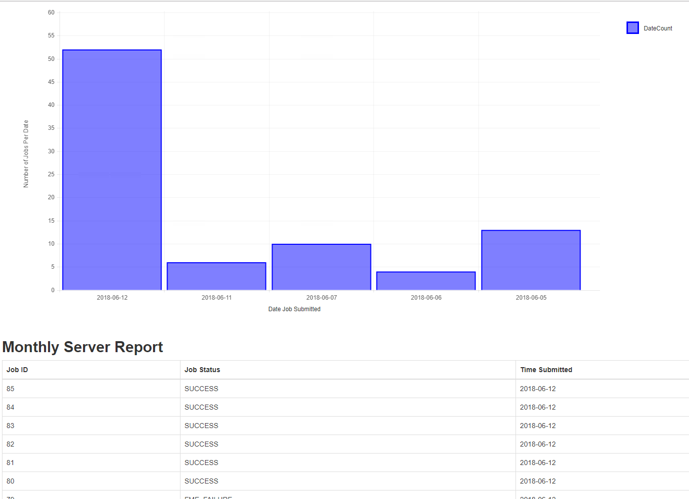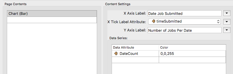 Next, we attach another HTMLReportGenerator. Under Page Contents select Chart (Bar). Then under Content Settings fill in the X and Y labels. The X axis label is Date Job Submitted. The X Tick Label Attribute is timeSubmitted. The Y Axis Label is Number of Jobs per Date. The Data Attribute is DateCount and the Color is 0,0,255. The parameters are set up below: