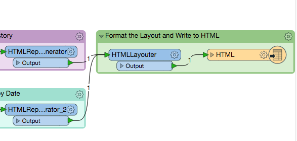 Add the HTMLReportGenerator and attach it to the Sorter transformer. In the HTML Report Generator, we can add custom HTML or a table with information gained from the FMEServer.