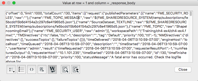 Once the FME Data Inspector is open. Select the response_body. This response_body contains all the job obtained by the API.