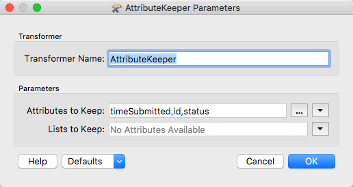 Next, add the AttributeKeeper. Attach the AttributeKeeper to the JSONFragmenter. Under parameters and Attributes to Keep: write timeSubmitted, id, status.