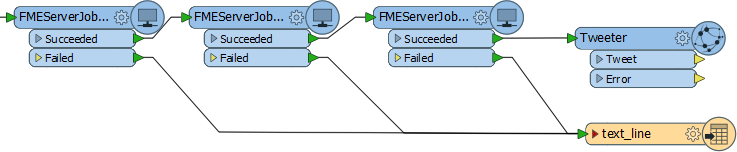 Here a control workspace is using the FMEServerJobSubmitter to run three further FME workspaces. Maybe each workspace is a separate step in a database update process: