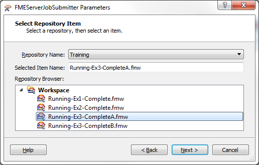 In the first dialog enter your FME Server connection parameters. In the second select the first workspace (the one that converted election divisions from GML to SpatiaLite):