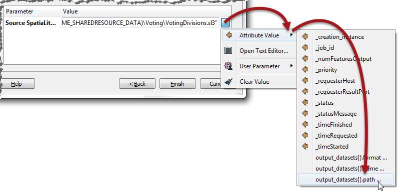 Open the wizard for the second FMEServerJobSubmitter transformer. This time the Job Parameters dialog will include a parameter for the source dataset.